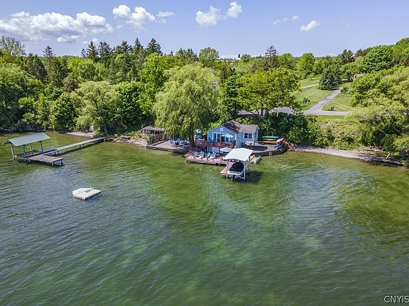 Amenity rich property sited on 3 acres of gentle lakeside land w/ sweeping views of Cayuga Lake. In the heart of historic Sheldrake, Cayuga Lake's iconic lake living community, you will find a custom-built home that features floor to ceiling windows, expansive deck & patios, cooks kitchen w/ large pantry, custom tile work, master crafted built-ins, gallery lighting, primary on-suite, acc apt, utility room w/ dog grooming sink, wine cellar, oversized detached 2 car heated garage & upper-level bonus space, and enclosed RV/Boat parking & 30-amp plug. PLUS a charming seasonal cottage w/ multi-level decks, docks, seawall, shale beach, boat lift, swim dock, kayak launch, most cottage contents convey. Between the house & cottage is a small two-lane road, which has few cars & serves primarily as a walking, jogging & biking trail. It is this road that joins the neighborhood together & makes Sheldrake the wonderful lakeside community it is. Offers reviewed 6/6. Don't miss the VIRTUAL TOURS! Square footage shown is combined sq ft of both houses, see floor plans.