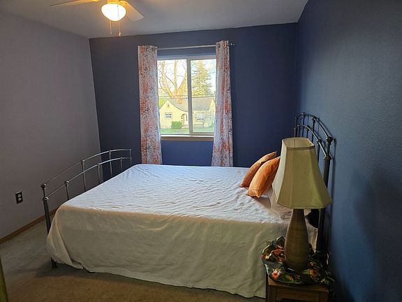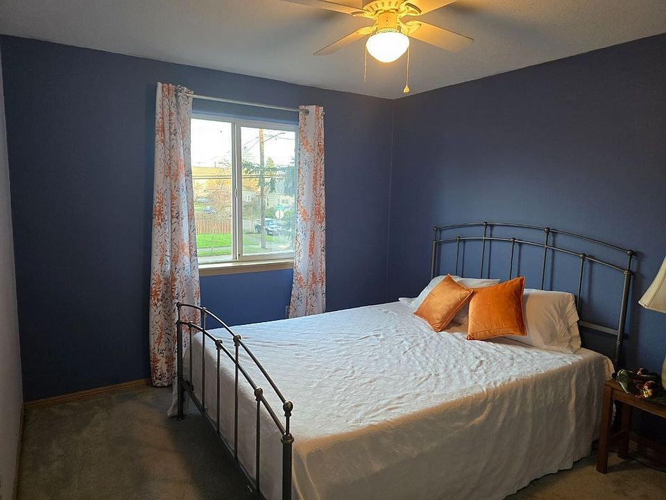 The rooms are upstairs with east facing windows. There is a walk in closet in the larger room and a double closet in the other room. Both have a ceiling fan, and a wall heater with thermostat control. The private bathroom is located adjacent to the rooms. The shared laundry is located upstairs in the hallway across from the bathroom. The kitchen has designated space for everyone's food. Shared meals are welcomed. The dining area opens to the back garden surrounding a patio perfect for dining or taking in the scenery. The cozy living room has a fireplace and an air conditioner. The garage holds tools and gardening supplies with some room for storage. Street parking is available. Near two bus stops.