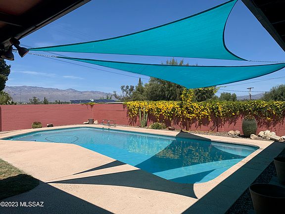 Darling mid-century house with fun artistic touches. Large (2268 sf) with good-sized rooms. 3 bedrooms, 2 baths, separate dining room, bonus room - could be an office or gym - and a big interior storage room. Refreshing pool with shade sails, recently resurfaced. Backyard with tall walls, and views of the Rincons and Catalinas. Exterior storage shed/workroom. New HVAC in March of 2021. Roof resurfaced In May with a 3-year warranty. No HOA. Room for an RV. This house has been loved and well maintained. Seller is only the second owner!