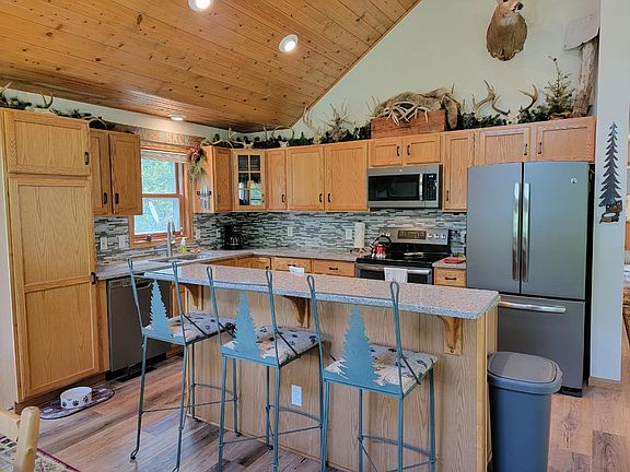 WELL-APPOINTED COUNTRY HOME on 16.8 nicely wooded acres with 3 ponds and Jennie Creek cutting through the property. The home features 3 bedrooms including an owner's suite, 2 full baths, beautiful open great room with cathedral wood ceilings and a stone fireplace, decked out kitchen with quartz counter tops, and a main floor laundry room. The lower walk-out basement has 9' sidewalls and is stubbed for a third bath. It is currently a blank canvas awaiting your finishing design. Updates include kitchen and bath upgrades, shingles and flooring. There is a 2+ car attached garage for the cars and storage. Outside you will find a nice fenced in area of the yard, a chicken coop, substantial landscaping touches, a concrete entry porch and a large open-air deck. The land is well wooded with some clearing around the home and 3 separate ponds along with several hundred feet of Jennie Creek frontage. The property is located conveniently between Tomahawk and Rhinelander with easy access to Hwy 51.