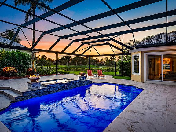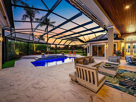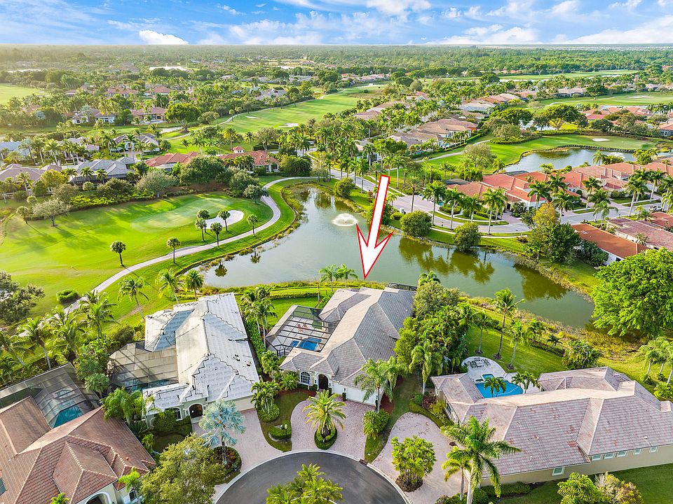 Located on a .38-ACRE, PIE-SHAPED, CUL-DE-SAC lot--the largest in Monte Verde--this spectacularly RENOVATED COURTYARD home with PRIVATE GUEST HOUSE will wow you from the moment you step through the gated entry and into the massive screened pool and spa area. Overlooking postcard-worthy views of Tradition #16, this 4BR/4BA home boasts an oversized yard and two separate completely renovated outdoor spaces, both done in 2021: The grand courtyard features a New PICTURE WINDOW SCREEN ENCLOSURE (2,000+ sq ft), new fencing, new porcelain tile and artificial turf surrounding the pool, new Caribbean Blue Diamond Brite, and showstopping Waterfall Fire Bowls. Cedar Wood ceilings add richness to both the Pool Lanai and the Back Lanai. The Back Lanai, covered and fully screened, features new Porcelain flooring, a new grilling station with granite counters, retractable awning and breathtaking lake and golf vistas. With a combination of IMPACT GLASS (2020) and Accordion Shutters (2021), this home is protected with a 2020-installed Generac 22Kw WHOLE HOUSE GENERATOR. In 2023, an Aqua Link Operating System was installed to control pool features and landscaping lighting (front and back.) Also in 2023, a motorized privacy/sun blind was added to the front gate. And also in 2023, the kitchen was remodeled with New white shaker cabinet doors and drawers with soft close hinges, gold hardware, blue mosaic tile behind the range/hood and appliances fit for a chef: Sub Zero 42" refrigerator with French Doors and a Bottom Freezer, Wolf 30" Double Wall Ovens, and a GE Profile Microwave. With this sought after floor plan, all bedrooms open graciously to the courtyard area, with the serene backdrop of Ibis's world class golf and water vistas. Plush designer carpeting installed in three bedrooms in 2022, and motorized transitional light filtering shades in all four bedrooms (windows and doors), great room windows and dining room window and back door (2021 and 2022). New laundry room cabinets in 2022 along with new striking granite counter tops. In 2021 the water heater was replaced and in 2022 the pool pump was replaced. New Pineapple Exterior lighting on Garage Front and Courtyard. Two newly remodeled bathrooms in 2021. A new Air conditioning unit was also installed in 2021. Live the incomparable Ibis lifestyle from this magnificent, one-of-a-kind home on one of the most unique and special lots in Ibis.
