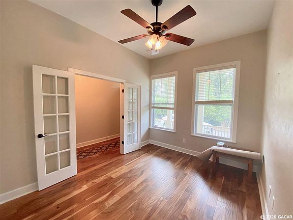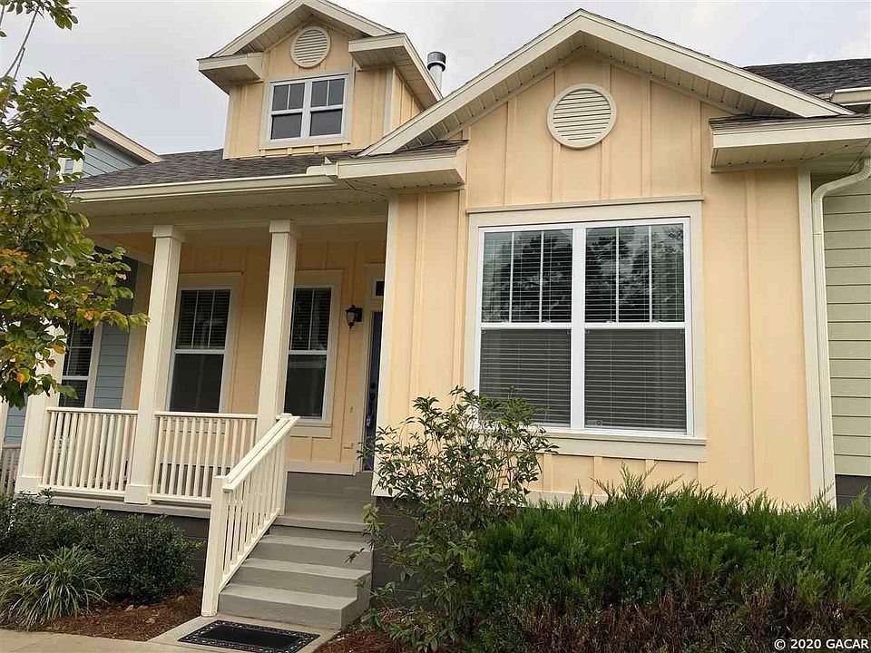 Beautiful modern 3 Bedroom, 2 Bath is located in Tower 24. This home is immaculate and move-in ready with gorgeous hand scraped wood floors, crown molding, high ceilings, granite countertops throughout, stainless appliances and a wood burning fireplace that could easily be converted into gas. Luxury master bath with double granite vanities and walk in shower. Separate laundry room which includes Washer and Dryer. Surround sound system with blue-ray player is included in the great room. Freshly painted interior. 2 car detached garage with rear entry. Low maintenance luxury town home. HOA covers all the exterior maintenance. New paint on exterior November 2020. Very Desirable location and is convenient to shopping, UF, Butler Plaza, Celebration Point, Publix, UF Health and many restaurants. Welcome home to Tower 24!