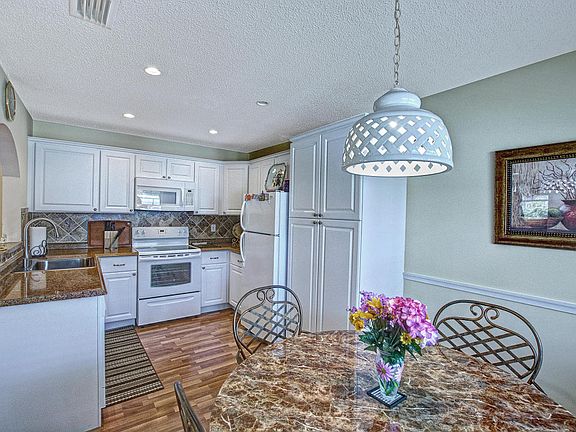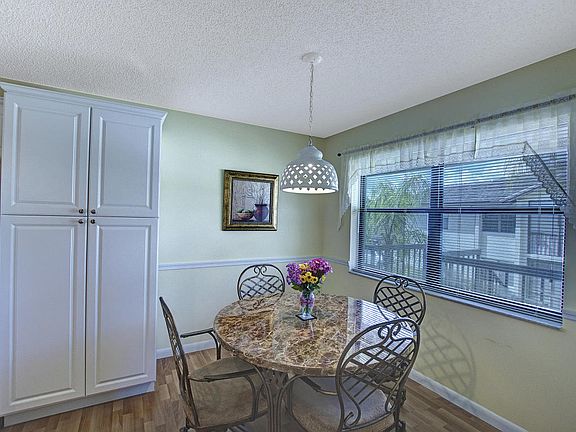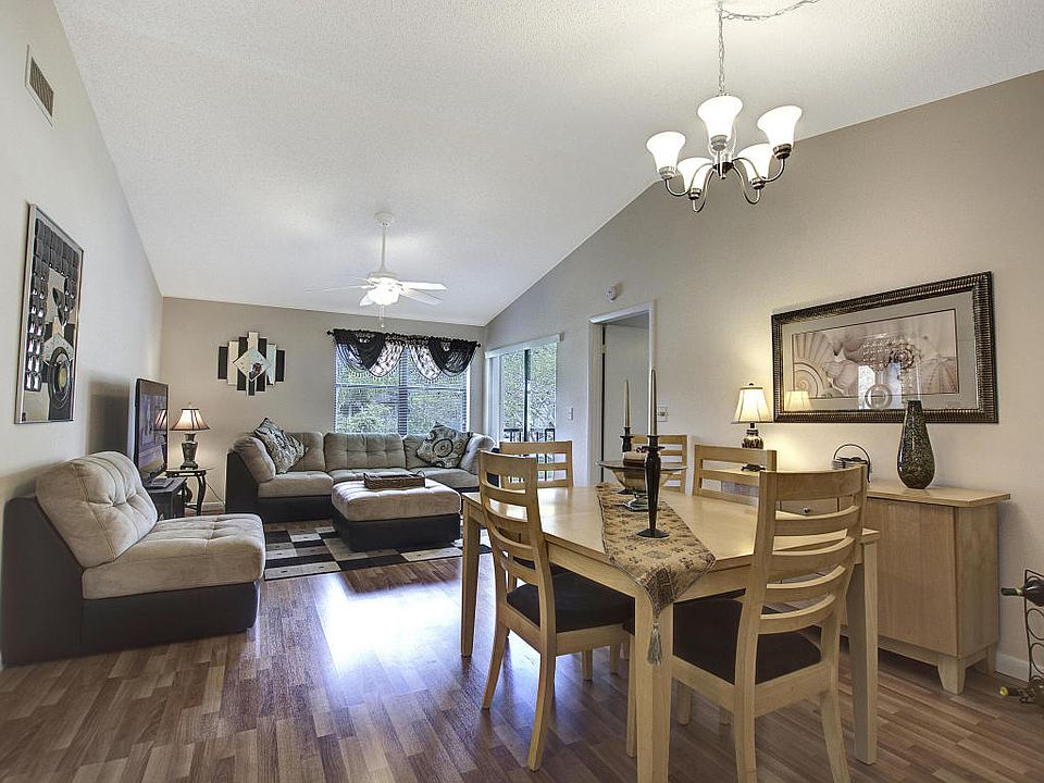 This bright and light updated **fully furnished** condo has 2 spacious bedrooms and 2 baths located in the community of Lucerne Point. The open floor plan features a large living and dining room space with cathedral ceilings. Over-sized windows to bring plenty of natural sunlight and glass sliding doors lead to a covered and screened balcony with storm hurricane shutters. The kitchen is fully equipped with all appliances and generous cabinets for storage. This is a large eat in kitchen with a cozy casual dining area. Between the kitchen and dining room there is a convenient pass through ideal for serving and conversing with your guests while you cook. Updated flooring and neutral painted rooms add to this condo's bright open feeling.