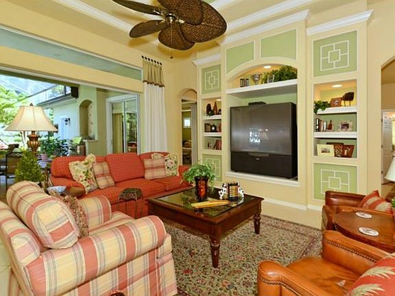 AWC - Taking Backup Offers Stunning 2 Bedroom + Den, 2 Bath, 2145 sq ft home in exclusive Lakewood Ranch Country Club. The den can easily be converted to a 3rd bedroom. This popular Aberdeen model was built by Neal Homes as its model in the Gleneagles community. As such, it is loaded with upgrades. The home features custom window treatments and fixtures; vaulted ceilings; solid cherry kitchen cabinets; new stainless steel appliances; tile throughout all areas except the bedrooms; coffered ceilings, built in large screen TV and shelves in the family room; a built-in buffet in the dining room, built-in desk and shelves in the den and laundry room; and intercom music and central vacuum systems. The oversized master bedroom suite features 2 walk-in closets (one with custom shelving) and a spacious bath with garden tub and private access to lanai. The great room opens through pocket sliders to a private tropical paradise lanai featuring Tuscan brick pavers, a pool with a soothing waterfall, an outdoor kitchen with gas grill and lush landscaping. The extra wide 2 car side-loading garage provides plenty of room for extra storage. A new, cost efficient heat pump and A/C unit was installed in 2014, as was a new motor and timer for the pool. Gleneagles is a maintenance free community with a community pool and enjoys the lowest maintenance fees in the Country Club. It is within minutes of I-75 and the new UTC Mall, world class rowing facilities, polo fields, movies, restaurants and just a short drive to the Sarasota beaches.