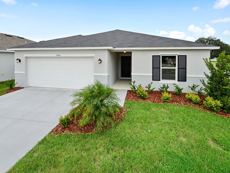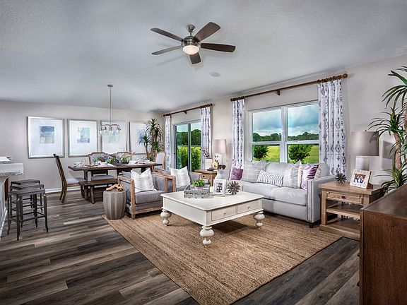 This stunning home occupies a corner homesite and immediately impresses with its professional landscaping. Stepping inside, the home features tile flooring throughout the main living areas and wet areas, with carpeting in the bedrooms. Volume ceilings expand over the great room and kitchen to enhance the already open concept floor plan. The kitchen is loaded with upgrades and features gray cabinets with custom hardware, granite countertops, Whirlpool® appliances in stainless steel, and a generous island with pendant lighting. The master suite includes a private bath with an enlarged shower and custom tile surround, a dual-sink vanity, and a walk-in closet. Enjoy an extended covered patio just off the great room.