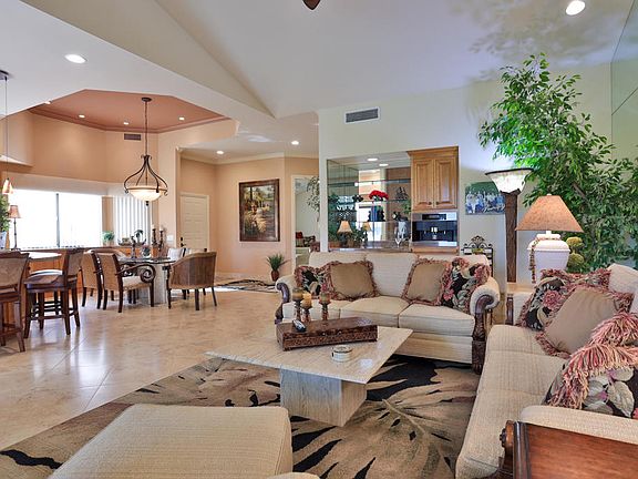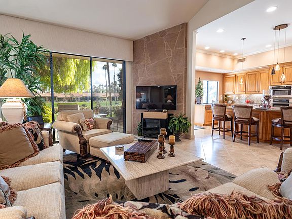 Don't miss out on this opportunity to own this desirable condo with ''southern views'' with an exceptional price point for the level of upgrades and amenities included. This beautifully re-imaged 3 Bedroom, 3 Bathroom, 1918sf., Sycamore plan ''end unit'', furnished condo is situated directly on the golf course. Step into this iconic, island-inspired retreat where the timeless elegance of a Tommy Bahama theme meets the comfort of inspired living. You'll be captivated by the expansive open-concept interior. The spacious living area flows seamlessly into the gourmet kitchen, featuring high end appliances, slab granite countertops, rich wood tone cabinetry, Island with slab granite, seating & storage. Perfect for entertaining and daily living; large sliders, vaulted ceilings, bathe the home in natural light, offering views of the golf course from the kitchen, dining and living areas. Each bedroom offers its own sanctuary with ample closet space, while the luxurious bathrooms boast upgraded walk-in showers, granite slab counters. The primary suite provides a tranquil escape with its own ensuite bathroom & access to a private outdoor patio. This highly upgraded home offers not just style but convenience, located close to the Clubhouse, steps to a pool & located on a cul de sac street. This is luxury living made affordable. Schedule your private tour today! ''Priced to Sell'' this condo offers ''incredible value''.