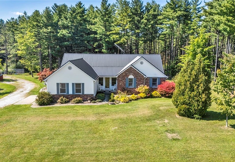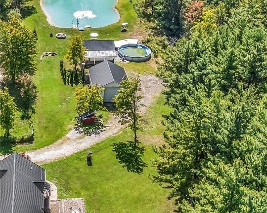 ~Rambling Ranch~ set on 4+ acres with a large pond and fountain, perfect for swimming, fishing, and relaxing at the canoe dock. An expansive waterfall feature has been planned, prepped and begun~ which IS NOT TO BE MISSED during your tour. The lot is level with mature trees along the rear property line and a generous setback from the road. Two accessory buildings provide outstanding flexibility: a 24x32 outbuilding with electric and room for 4+ vehicles and equipment, plus a 16x24 building for additional storage and covered porch area. There is even a chicken coop with pen area and a firepit to enjoy the starry nights!! The attached 2-car garage brings total indoor parking to 6+ vehicles. All buildings feature durable metal roofs with a 50-year lifespan. An above-ground pool with wraparound decking is ready to open next season. *RARE Fully fenced property*