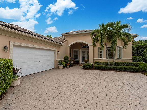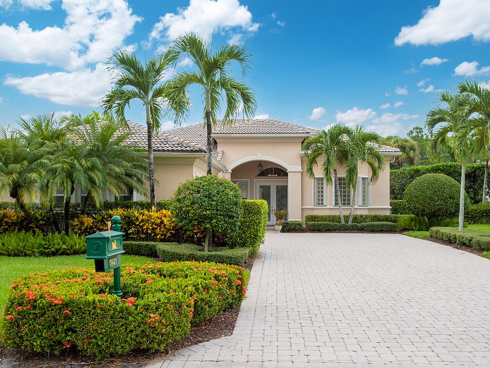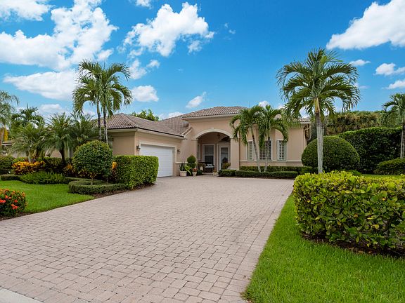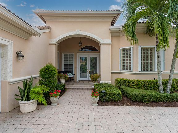 Country Club living , WITHOUT the mandatory membership fees. Meticulously maintained 2,215 SF 3 bedroom 2.5 bath home with 2.5 car garage . Room for 2 cars plus a golf cart! Many upgrades in this Pool home located on a 16,117 sf lot with amazing custom lit landscaping, Salt system pool is phone app enabled. Enjoy the shade from 2 powered retractable awnings as you sit by the pool and hot tub. Interior features many upgrades. Master suite plus a 2nd suite! Granite counter tops and Island, custom cabinets. Crown molding in all living & bedrooms, upgraded flooring, powered window blinds in kitchen area. Upgraded lighting, master bath and more. NO pet restrictions, NO approval process. Yes , all drapes stay! Lawn and landscape trimming covered by HOA. Complete accordion hurricane protection.