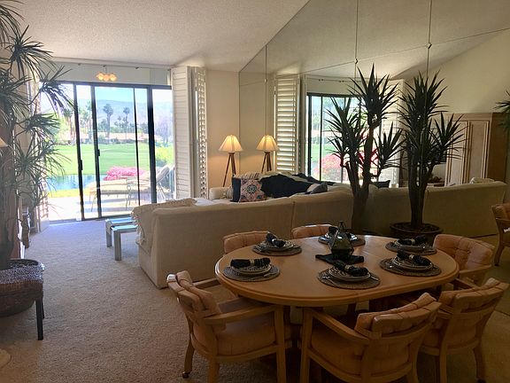 Gorgeous trifecta VIEWS (water, mountain and double fairway golf course views) from this Jacaranda plan condo located on an elevated lot overlooking the 14th and 15th fairways of Palm Valley County Club's Championship course and FAR AWAY from the train tracks. . Beautifully cared for. The combined living room/dining room feels light and bright with high ceilings. Outside you'll find 2 patios for partaking in the outside living that the desert is so famous for; a cozy private courtyard patio by the front door and a rear golf course side patio. Palm Valley Country Club is referred to by many as the Fun Club, with two 18 hole golf courses, a 100,000 square foot clubhouse with a Junior Olympic pool, fabulous fitness center, spa, beauty shop, restaurant, bar and both golf and tennis (pickleball) proshops.