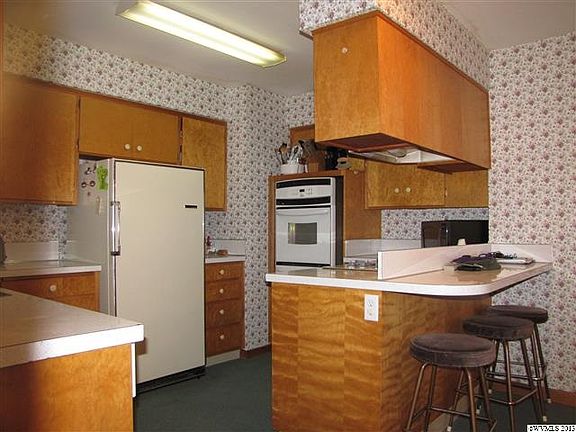 Spacious rooms, storage-storage-storage, & covered RV parking located on a double lot in town! What more needs to be said? The kitchen has solid wood cabinets, gas stove top, a double oven & opens up to the eating area w/bar. The home has updated appliances, windows, & high efficiency furnace. Don't forget to check out the over sized garage with room for a shop. This home was appraised for $165,000 in June. New carpet has been installed in living room.