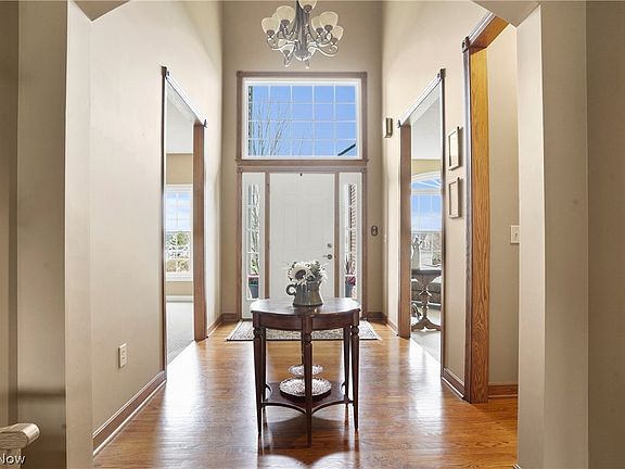 Nestled within Pheasant Hills sits this expansive custom-built Mosely & Mosley 5-bedroom colonial. Upon entry, a welcoming two-story grand foyer greets you, bathed in natural sunlight and stunning hardwood floors. Formal dining room on one side and A charming sitting room featuring transom windows adding architectural intrigue on the other. Dining room features space-saving pocket doors offering privacy. Family room seamlessly connects to the kitchen and second-story loft, creating an inviting space for gatherings. The fully equipped kitchen boasts granite countertops, a center island, breakfast bar, stainless steel appliances (including a double convention oven), and pantry. The owner's private wing, situated on the 1st floor, presents an expansive bathroom with a Jacuzzi tub, 5-foot shower w/dual shower heads, patio access, & an office space, providing a secluded retreat within the home. Conveniently located on the 1st floor, the laundry room offers easy access, along with a mudroom from the attached 2.5-car insulated heated garage. 4 additional bedrooms are located off the loft area on the 2nd floor,3 of which offer walk-in closets. The 15-course basement boasts higher ceilings, elevating the lower level, & features a dry bar. Ample storage is available in the unfinished areas, w/plumbing already in place for an additional bathroom. Elegance & durability are accentuated by solid oak trim throughout the interior spaces. Recent upgrades include newer windows Nov '23, along with new carpeting in many areas. The furnace and Aprilaire '24, with AC updated approximately '19. Backyard oasis offers a serene retreat w/a beautiful paver stone patio, fire pit, & a storage shed, creating a private park-like ambiance. Beyond the development, residents enjoy easy access to Wadsworth local schools, the Community Center, local shops, parks, and major highways. In summary, this property harmoniously blends elegance, comfort, and convenience, making it an ideal place to call home