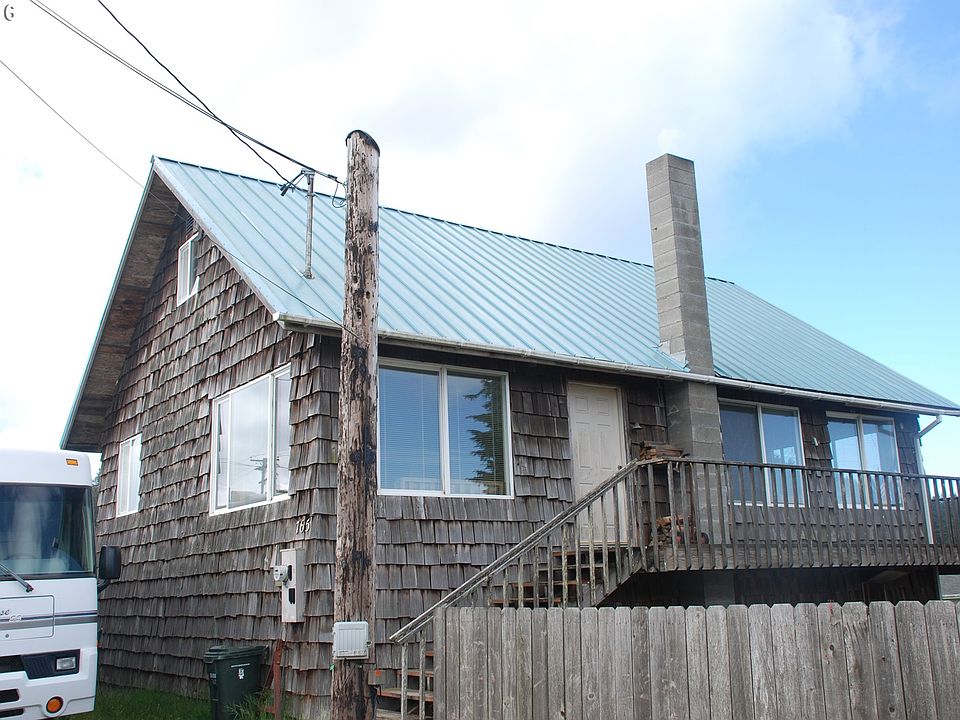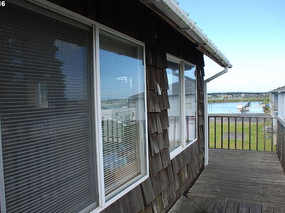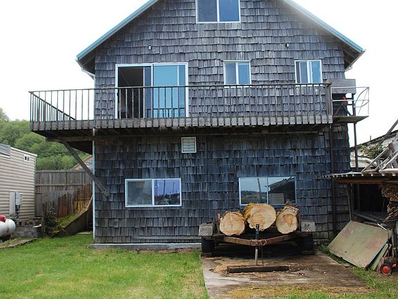 Beautiful sunsets from this custom built, Bay view, home. Comfortable open living area for full-time living or your home at the Coast. One block from the Harbor. Two bedroom, one bath on main level above the huge shop and garage. Garage boasts 11 ft. high door and separate bath with shower. Custom built-in cabinetry throughout home. Deck overlooking the harbor. Top floor is great for storage or hobby room. Almost new 60-year metal roof.