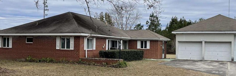 Pear treesHolly ledgeHigh garage doorDetached three-bay cinder-block garageRose bushesCrepe myrtlesQuiet setting