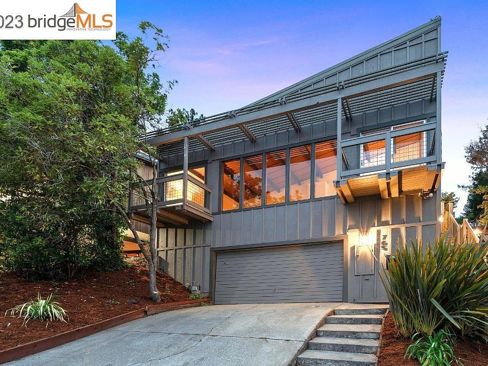 Fantastic Mid-Century Modern Berkeley Hills view home! Captivating Bay, Bridge and Cityscape views from this custom architect designed 1964 abode. Soaring vaulted ceilings in the living and dining rooms create drama and expansiveness while a central courtyard unifies the public rooms. A half level up separates the three bedrooms (originally 4 bedrooms--the middle bedroom was opened into one double sized bedroom), including a spacious primary suite (with ample closets) which opens onto the large backyard. Solar panels provide energy efficiency. Spacious garage with storage plus off street parking in the driveway. Open Sat/Sun 10/14&15, 21&22 from 2-4:30.