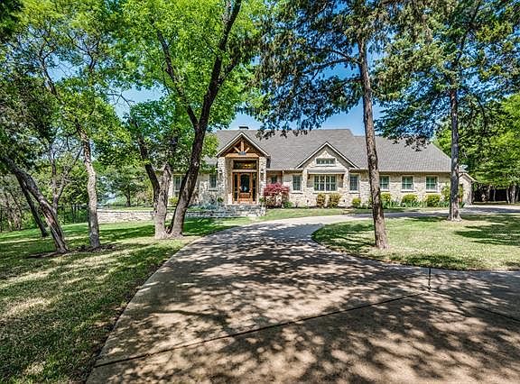 Picturesque drive to the front of this custom Hill Country inspired home, nestled among the trees and wrapped in Granbury stone. Truss wood beams in the living area greet you. The spacious open concept floor plan and bedrooms, each with en suite bath & walk in closet are impressive. The master bath has a steam shower, separate vanities, separate water closets and a jetted tub giving a spa feel. The gourmet kitchen boasts 2 ovens, a warming drawer, 3 dishwashers, a Viking stove, a wine cooler, trash compactor, granite counters, island with a second sink and entertaining pantry. The vaulted outdoor patio with fireplace beckons you outside to enjoy the water view of Joe Pool Lake in the distance as the sun sets.