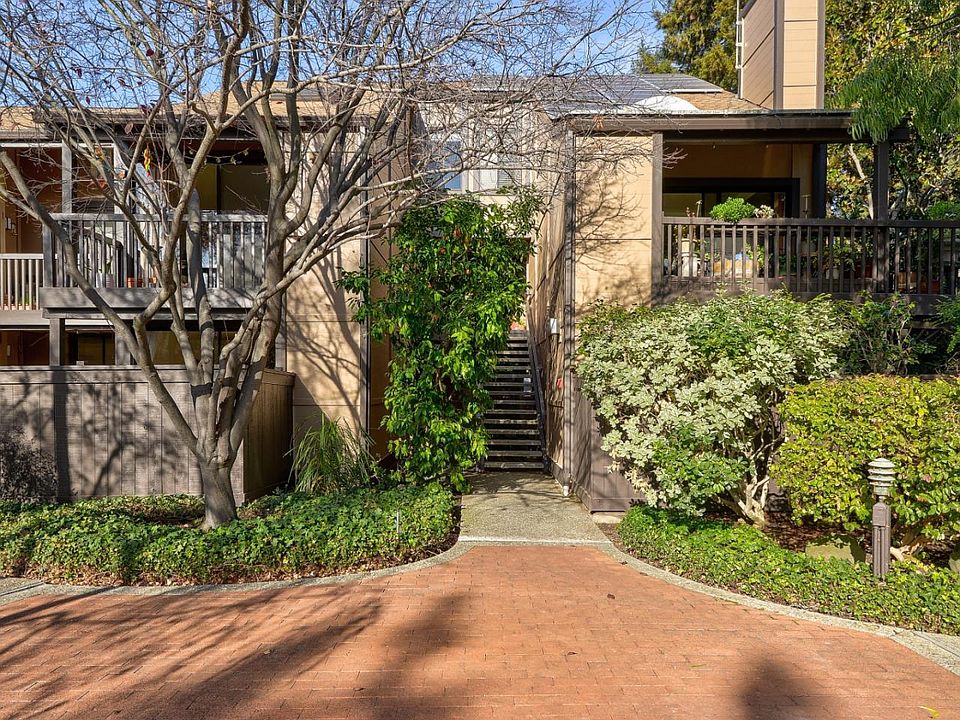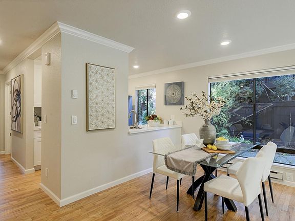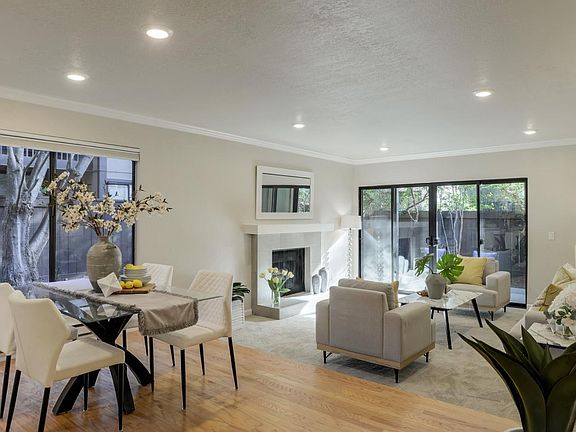 Completely remodeled 1st floor condo end unit w/ a large backyard, front patio & garage. Formal entry w/ coat closet Hardwood floors. Open kitchen w/ breakfast bar, Shaker style cabinets, Quartz countertop, stainless appliances & window that overlooks lush common area. Separate dining area w/ hardwood floors, large window to insure natural lighting thru-out. Step-down living room w/ plush carpeting, tiled fireplace & hearth, contemporary mantel, recessed lighting & glass doors to a private front patio. Oversize separate laundry room w/ full size washer & dryer, vinyl plank floors and additional storage / pantry. Large full bathroom with vinyl plank floors, shaker vanity with quartz counter, custom corner to corner mirror, shower over tub with designer tile surround & glass shower enclosure. Huge master suite with wall to wall closet space, plush carpeting & sliding glass doors to a wrap backyard with side gate for easy gardening access. Desirable complex w/ pool & convenient location.