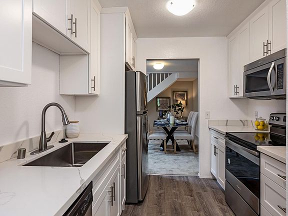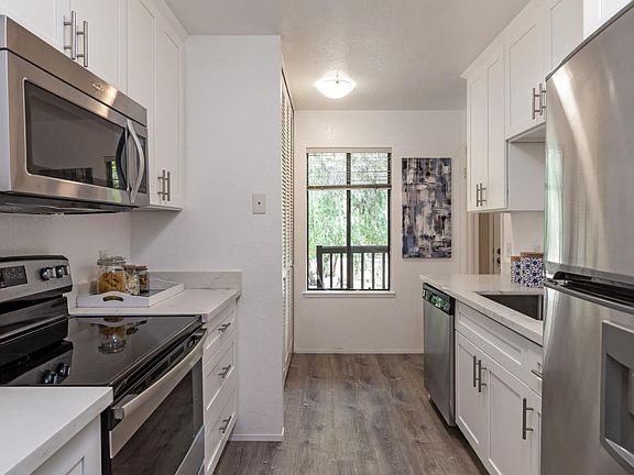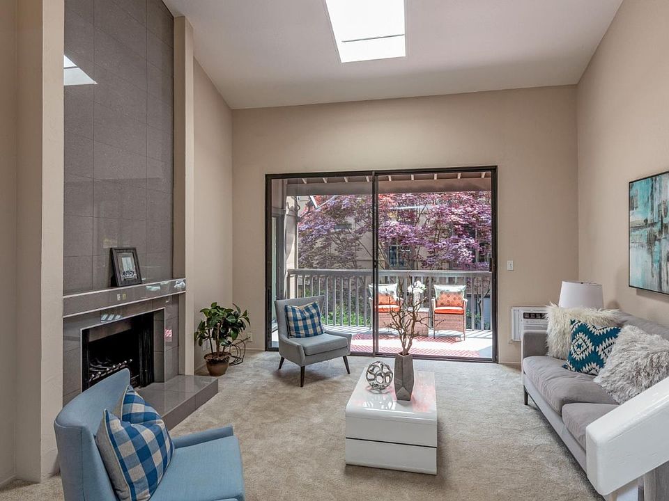 This dramatic & remodeled 2 bedroom, 2 bath top floor condo end unit is located in a desirable & convenient location in central Mountain View. The formal entry will present a substantial living room with soaring vaulted ceilings, new AC unit, floor to ceiling tiled fireplace & wall to wall glass sliding doors to a private patio. First floor bedroom suite with glass doors to the adjoining patio, Shaker style vanity cabinets, Quartz counters, tiled shower over tub with glass enclosure. New kitchen with Shaker style cabinets, Calcutta style quartz counters & stainless appliances. Full size washer & dryer. Large, enclosed loft 2nd bedroom suite with high ceiling, new wall AC unit, ample closet space, bonus storage area & large windows to ensure natural lighting. Full guest bathroom with Shaker style vanity, quartz countertop & shower over tub. Detached garage plus additional parking. Well maintained complex with swimming. Active location near shopping, schools, eateries & freeway access.