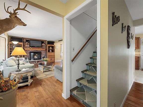 Incredibly Welcoming 1.5-Story Home with Finished Lower-Level! Privately nestled on a sprawling 1.9+acre lot, this 3BR/2BA, 2,189sqft property offers storybook charm with a beautiful brick façade, whimsical mature trees, and an inviting covered entrance. Step inside the immaculately maintained home to discover gorgeous hardwood floors, soft natural light, a spacious living room w/gas fireplace, a cozy dining room, and an upgraded kitchen featuring stainless-steel appliances, wood cabinetry, breakfast nook, and a pantry. Two generously-sized bedrooms and a full bathroom are located on the upper level, while the main level caters to multigenerational needs with a large bedroom and a full bathroom. Relax by the wood-burning fireplace in the lower-level family room, or bask in the phenomenal outdoor space with a massive deck and firepit. Other features: detached 3-car garage w/bonus 10’ garage door, laundry area, close to I-44 and restaurants, and so much more! Call now for a private tour!