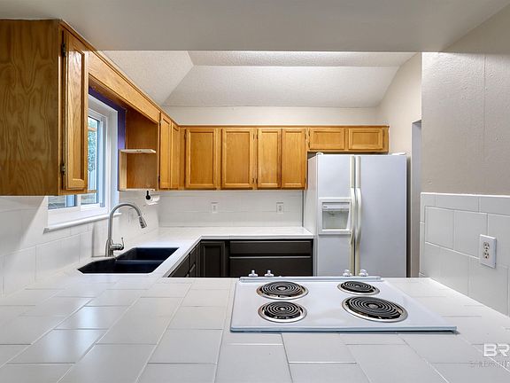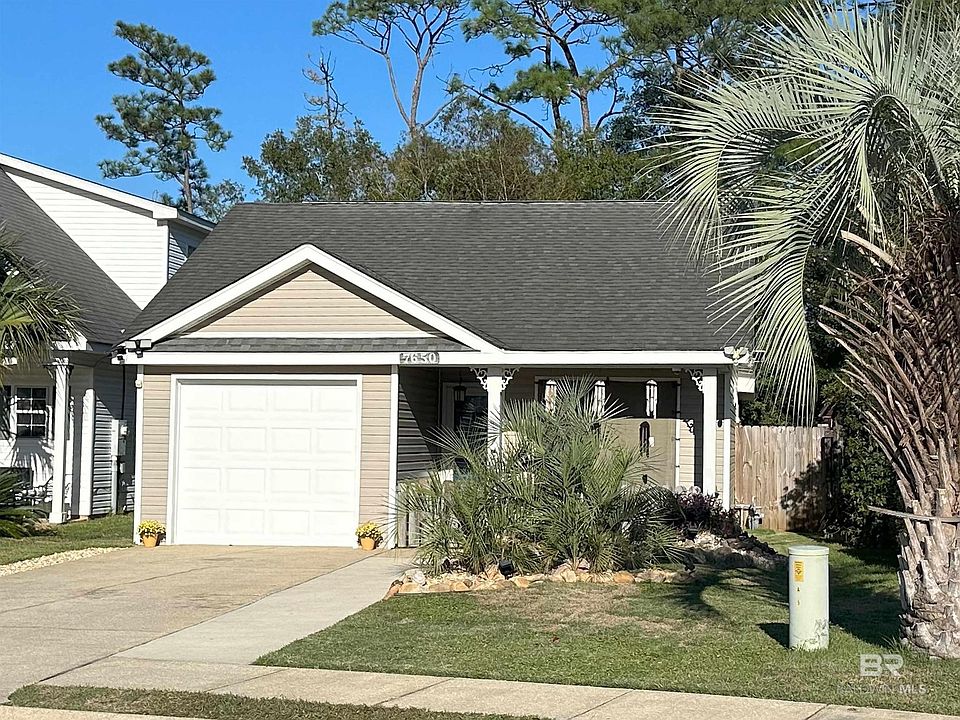 Adorable Cottage in fabulous location 1/2 way between the Beach and Foley in cute subdivision, Audubon Place with maintenance free vinyl exterior. This 3 BR 2 Bath home has tile throughout. 9' ceiling in hall and living area. Turtle back ceiling in Primary BR. There are two tone, soft close cabinets in the kitchen. Counters and backsplash are tile. Crown molding is in hall, LR and primary BR. Primary BR has a walk in closet and separate water closet. 3 big windows have hurricane shutters. Windows were new in 2015 and french door in 2017. New roof installed in 2015. There are 2" blinds throughout. The back yard is privacy fenced with a large satsuma tree. For your small dogs the front porch with quarry tile is fenced so they won't get out when you open the door. There is a small screened porch in the back. Seller will transfer 2 year home warranty to buyer at closing.