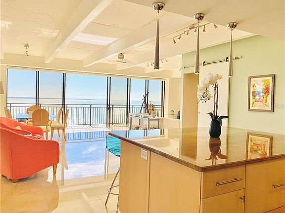 Rarely available Gulf Front Penthouse, entering this exclusive residence, the stunning panoramic waterfront views of the Gulf of Mexico take your breath away. Situated at the end of Sunset Beach,7650 Bayshore is the Gulf front of the two towers and Penthouse 1202 is the pinnacle of this coveted community. Facing the much sought after southwestern exposure, this penthouse boasts unmatched views of the sparkling Gulf of Mexico, the turquoise waters of the intracoastal waterway, the sparkling lights of Downtown St Petersburg, and spectacular sunsets every evening. This residence has been stripped to the studs and completely redesigned, opening walls to take full advantage of the views offered by floor to ceiling sliding glass doors across the entire spanse of this re imagined open concept living space.The newly designed interior boasts an enlarged kitchen, outfitted with walls of new driftwood toned cabinetry,level 5 stone countertop that echo the colors of the Gulf views and its sunsets, ,stainless steel appliances, wine refrigeration, and a stunning oversized island. Oversized polished off white marble graces the unit, leading your eye to the views and oversized balcony. The Great room offers a generous space for dining, multiple seating areas, remote controlled solar shades, a beautiful oversized modern fireplace finished in seafoam glass subway tile and stainless trim, which reflect the flickering flames illuminating the room. The ceiling was opened up, adding 18 inches of height and exposing concrete beams tha t draw the eye upward and add beautiful texture. Bathrooms have been tastefully updated as well, with matching stone countertops and high-end finishes. Large bedrooms rest on opposite sides of the unit, with the master having its own foyer opening to more spectacular views.. The newly designed 2 bedroom features gorgeous The unit also comes with an interior laundry room complete with washer/dryer. The unit also comes with under building parking space. There is plenty of storage in the unit and additional storage in the lobby level locker. Mansions By The Sea is the ultimate in luxury resort-style living, this gated community offers a multitude of up-to-date amenities. Amenities include a large Gulf front heated swimming pool with a huge sunning deck, full fitness center overlooking the beach, two saunas, library, clubhouse with kitchen, large game room with billiards and ping pong, shuffleboard courts, and tennis courts, boat & RV parking, picnic pavilion, 6/10 mile (960 m) boardwalk for fitness walking and, best of all, the sandy beach on the Gulf of Mexico. In addition to direct beach access, restaurants and bars are just a short drive up the road for those seeking some entertainment. This exclusive Gulf front Penthouse offering is a rare commodity, schedule a private appointment while it is stil lavailable.