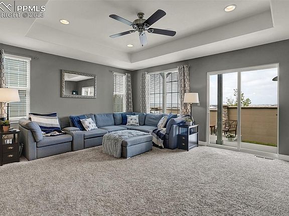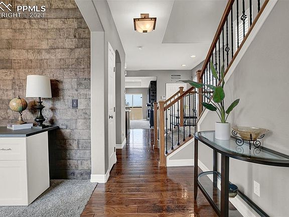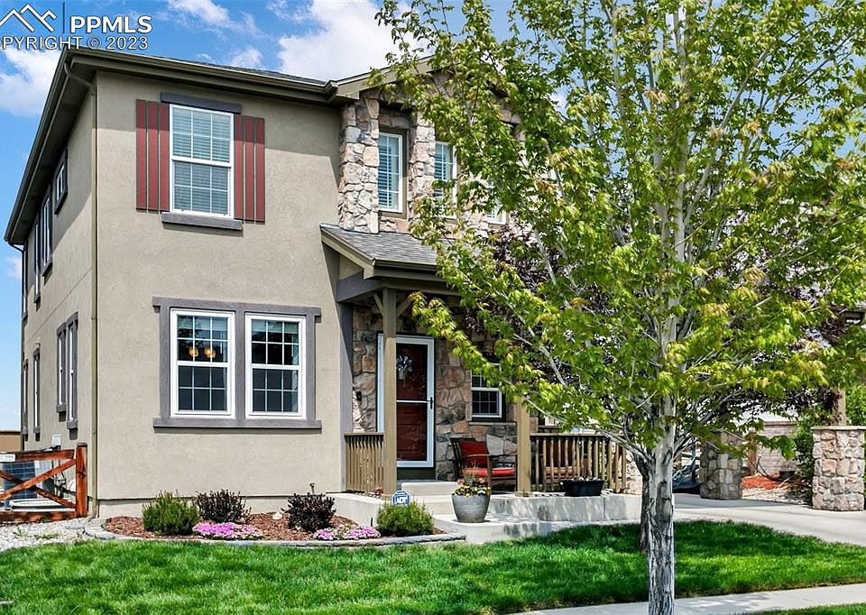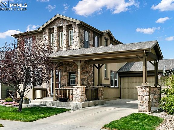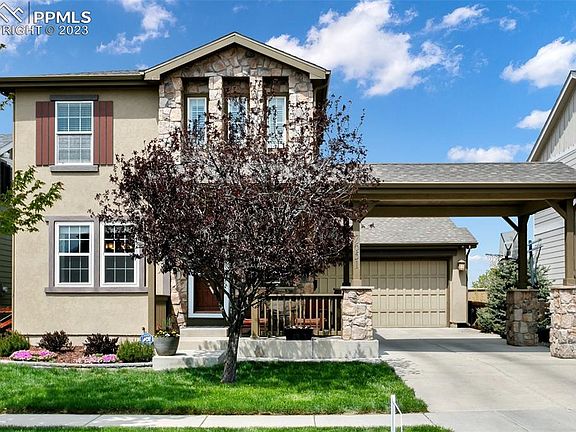 VIEWS, VIEWS, VIEWS! Schedule your private tour of this stunning home with MILLION DOLLAR views!! Located in the desirable Banning Lewis Ranch neighborhood that boasts miles of walking trails, parks, pools, and a recreation center, this home is a MUST SEE! Walk in the front door and notice the spacious office space that can double as a formal dining room. Walk through into the stunning kitchen that boasts granite countertops, NEW stainless-steel appliances, and a large walk-in pantry with custom shelving. The living room boasts a built-in electric fireplace and walk out access to the backyard space with STUNNING views of Pikes Peak. Walk upstairs and notice the two secondary bedrooms with an adjacent full bath, and convenient access to the laundry room. The primary suite is spacious with a full attached bath, walk-in closet, and access to a second story deck! Wake up and enjoy a cup of coffee while looking at the entire front range! The fully finished basement has a secondary family room, a bedroom, and a full bath for convenience. The extended driveway allows for extra parking and the covered carport is great for extra coverage when it rains! This home allows for easy access to Powers corridors and is close to TONS of dining and shopping options. Schedule your private tour TODAY!