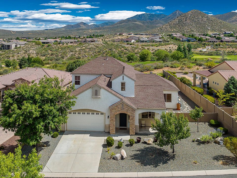 Beautiful Panoramic Bradshaw Mountain Views from this gorgeous Stoneridge Granite Plan, 5BR + Bonus room, 2Car Garage + Formal Living Room + Formal Dining Room + Great Room + Loft. 3487 Sq Ft. Open Concept Granit Kitchen w Stainless Appliances,Granite Butlers Pantry w/Wine Rack,Large Double Door Pantry, Double Oven with Recessed Lighting.Great Room w/Built-In Media Niche. Big Sunny Windows, Drapes, Carpet Flooring, Lighted Ceiling Fan & Tiles Dining Area with Slider to Rear Yard. Spacious Master on Main.