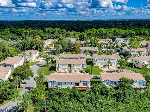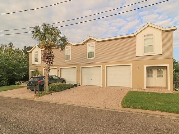 Sit on your deck and see the WORLD FAMOUS SUNSET over the Gulf of Mexico. Located on a quiet cul de sac, this home features pavers on 4 car tandem driveway and entry walkway to your Marina Palms townhome. An end unit making your open floor plan flood with light. A ground floor entry foyer also gives you access to your spacious garage. Second floor living with a split bedroom plan. Kitchen features wood cabinets with a family size coffee/breakfast bar, pantry closet as well as a laundry closet. Tray ceiling in the living room with high ceiling and crown molding throughout. Wood grain laminate flooring and sliding glass doors with transom windows open to the extended deck. Laminate flooring carries through the dining room and access hall to the split bedrooms and second bath. Master ensuite has a walk in shower, with a seat, floor to ceiling cabinetry and a walk in closet. Ground floor garage and storage space is nearly 1264', enough room for 6 cars plus storage, boats, kayaks, jet skis and any other big girl and big boy toys. Close to beaches or an easy walk to your gated sparkling community pool and spa, or you could take a golf cart.