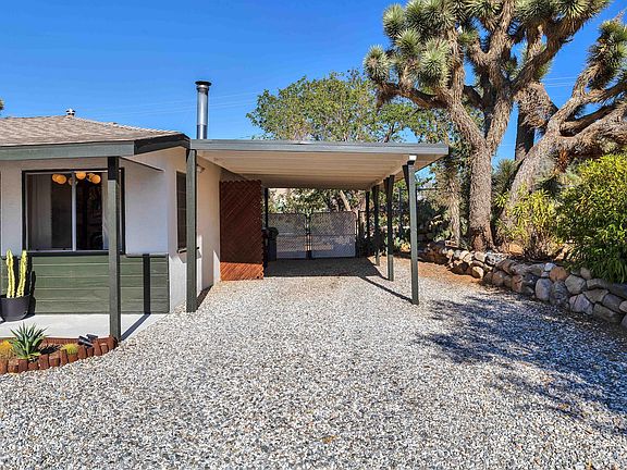 Welcome to your very own piece of hi desert magic! This intimate cottage (already connected to sewer) provides multiple areas, inside and out, for rest, relaxation, and fun. The vintage stained glass front door invites you into this chic, midcentury home, complete with pine wood paneling, original wood burning stove, and saltillo tiles. Tasteful light fixtures throughout with LED lighting, newer stove and refrigerator, and newer roof with recent exterior paint give this classic home a modern feel while preserving the hi desert aesthetic. The warm front porch provides stunning views of mountains, opportunities to connect with neighbors, and hours of enjoyment admiring the mature cacti landscaping. In the back you'll find a personalized cowboy tub, fire pit, and bocce ball court just waiting to entertain your friends and family. Enjoy the impressive collection of joshua trees, prickly pear cacti, agave, eucalyptus, and olive trees, creating an extraordinary private garden. Turn the shed into your private workspace and park your RV in its own separate, far-reaching space. Minutes from Old Town Yucca, Pioneertown, Pappy & Harriet's, and Joshua Tree National Park. Perfect for a weekend getaway, full time residence, and/or investment property. Welcome home :O)