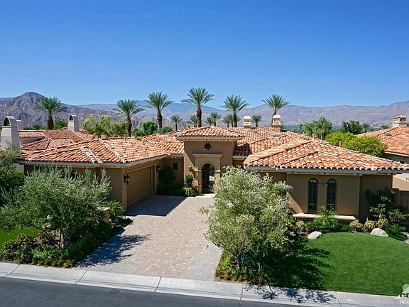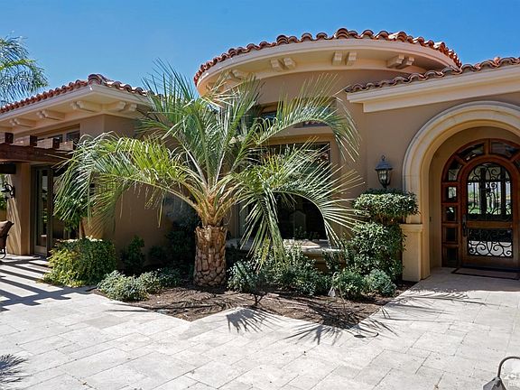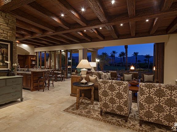 Breathtaking southern views of mountains and golf highlight this amazing home offering the finest in Desert living. Graceful lines of Italianate architecture adorn the home that features a four-car garage. The welcoming courtyard with a grand fireplace lead to the guesthouse and to the main entry. The dramatic open floorplan showcases the amazing views and the custom details including stone flooring throughout the entire home (inside and outside), wood ceilings, stone accent walls, oversized stacking nano doors and a large bar with pizza oven. The grand open plan is perfect for entertaining. The custom pool and spa has cascading water features and fire bowls framed by the spectacular views of mountains and golf. The master suite is complete with fireplace, sitting room and luxurious master bathroom. Guests enjoy privacy in a separate guesthouse with sitting and en-suite bathrooms or two additional guest bedrooms with en-suite bathrooms.