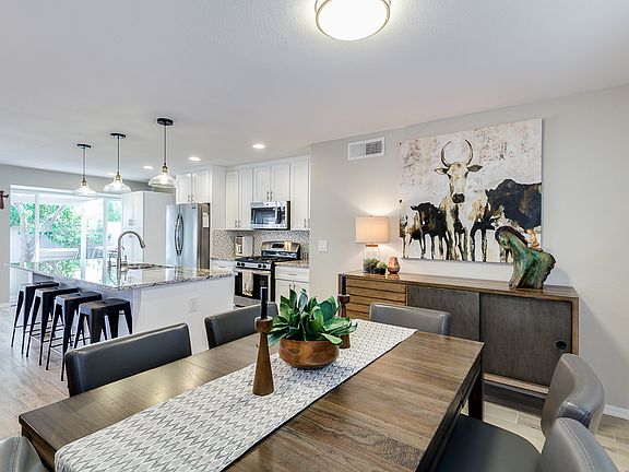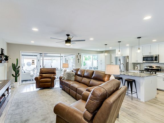 Stunning and bright remodeled Villa Monterey beauty! Neutral open kitchen/ living room concept with large granite island, gas stove, beverage refrigerator, 3 bedroom, 3 bath, double car port, sunny Arizona room, 2 covered patios, lovely outdoor patio area, tankless water heater, water softener and drinking water system. Heated community pool. Newly sealed roof. This is a 55 plus community close to great restaurants, parks, shopping, ball parks and more!
