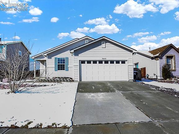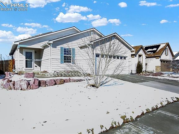 One level living, three bed, two bath, two car garage, backs to open space (train tracks) with mountain views, paid off solar and central air conditioning! Open floor plan with tons of natural light.Vaulted ceiling in the living room, dining room and kitchen. New carpet in the living room and one bedroom. Beautiful LVT flooring in the Entry, kitchen and dining. Ample kitchen cabinet and counter space, solid surface counters, stainless appliances, refrigerator included. Large master with attached three quarter bath and a walk-in closet. French doors lead from the dining room to the large rear deck with a covered pergola. Large backyard with a storage shed. Washer and dryer are included! Easy commute to I-25 and military bases.