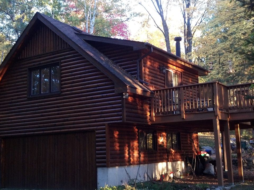 This remodeled Northwoods getaway features 2 custom-built, log-sided, 4-season cottages. The "Lake House" offers a living room overlooking a lake-facing deck, a kitchen with stainless steel appliances, quartz counters & butcher block island, wood ceiling & rustic plank flooring. The master bedroom has a walk-in closet & full, tiled bathroom. Paddle steps go to the lower level & 2 bedrooms, a den & full bath with stacked laundry. The "Roadhouse" is a large recreation room wired for surround sound, with kitchenette & 1/2 bath. The road level consists of a 1-car garage & workshop. Both buildings share the septic, newer well & security system. Each has its own furnace & water heater. Flagstone & crushed granite paths meander, while stone retaining walls & a firepit area overlook a party deck & the sand & stone frontage. The upper level of this parcel has a separate driveway lined by a hand-built stone wall, European root cellar & existing slab foundation for optional applications.