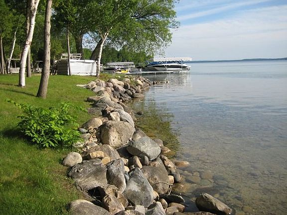 Spacious 2 bedroom home, with extra large living room w/fireplace. Dining room with bay window, family room with tile and carpeting. Sun-room with hot tub. Beautiful hardwood floors and large pantry in kitchen. Main floor laundry. Large 3 car garage and boat slip available. Large common area with decking and stone barbeque at waters edge. All this on 263' of beautiful Torch Lake.