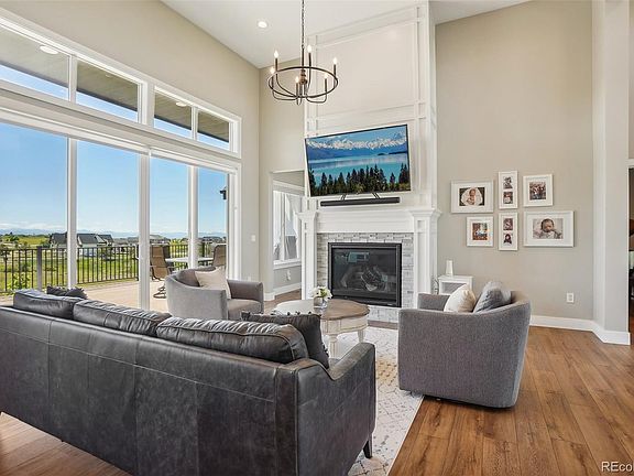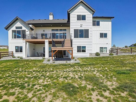 Indulge in the epitome of modern farmhouse living with this stunning residence nestled on a private 1.5-acre cul-de-sac lot! Thoughtfully designed and meticulously crafted in 2021, the quality and style are undeniable in this custom home. Every day luxury is embodied throughout the immaculate interior that boasts unobstructed mountain views from every west-facing window, chic bathrooms with quartz countertops, soaring ceilings, sleek black hardware, high-end finishes & large windows that let in natural light. The open concept floorplan is anchored by an elegant gas fireplace and has sliding glass doors that connect to the deck for a seamless transition to outdoor entertaining. The gourmet kitchen features quartz countertops, a sizable island with seating, abundant cabinet space, a Herringbone tile backsplash, a farmhouse sink, a walk-in pantry & stainless appliances. Your personal oasis awaits in the private primary suite that impresses with a cathedral ceiling, a huge walk-in closet & a spa-like 5-piece bathroom that has a freestanding soaking tub and an exquisite zero-entry shower. The main floor is completed by a dedicated office, a laundry room, a powder room & a handsome mudroom that leads to the oversized 3-car garage. Upstairs, there are 2 bedrooms connected via a Jack & Jill bath, a junior suite, a laundry closet & an expansive bonus room. Recently finished, the walk-out basement offers 3 conforming bedrooms, another bathroom & a rec room with a lovely full wet bar complete with a fridge, dishwasher, wine cooler, open shelving & built-in cabinetry. Take in the peaceful views of farm land from the charming front porch or enjoy the sunshine from the fenced backyard that backs to easements for added privacy and features a covered patio and playset. Other noteworthy upgrades include automatic blinds on the main floor and auto-timers on the exterior lights. Excellent Tallman Gulch locale; 10 min to downtown Parker and with easy access to I-25 and 470.
