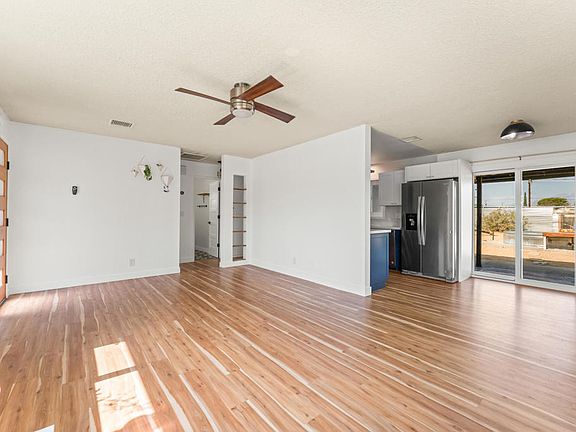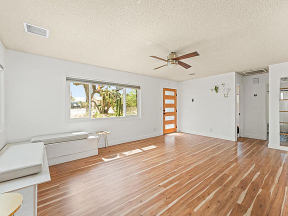 This charming home is situated on over 3/4 acre large lot street to street with potential to build ADU. Enjoy 2 bedrooms, 2 custom baths with huge bonus room that was designed to be used for extra bedroom, recreation room, family room, home business, the choice is yours. Stand out amenities include huge, fenced backyard, fresh landscape, new everything including, top of the line dual glazed insulated windows, new central air, new doors, floors, paint and appliances. Plenty of room to park your RV near oversized detached garage that could be used for shop/studio or whatever. Great proximity to everything in town and access to low desert/freeway. Nice neighborhood, scenic walkable area and minutes away from Joshua Tree, Pioneertown, stores, restaurants and antique/art malls.