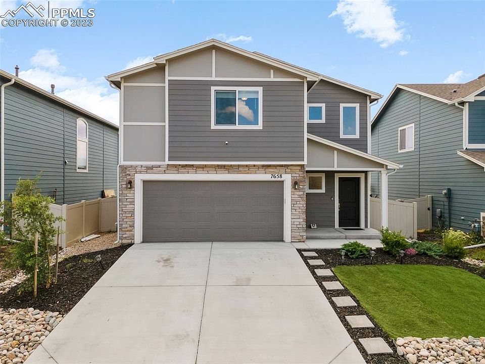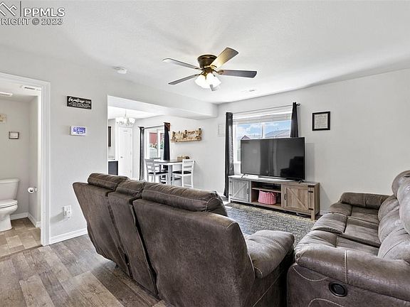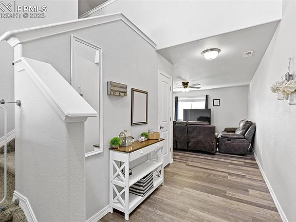 Welcome to this stunning 3 bedroom, 2.5 bathroom, 2 car garage home. Situated in the desirable neighborhood of Ventana, this property offers a combination of modern elegance and functional design. The front yard is xeriscaped with a mulch and rock boarder as well as astroturf for low maintenance living. As you enter the main level, you'll immediately notice the tastefully updated new LVP flooring, which lends a stylish touch to the entire space. The open kitchen is a chef's delight, boasting granite counters, stainless steel appliances, and ample cabinet space. The kitchen seamlessly flows into the dining area, creating an inviting atmosphere for entertaining guests or enjoying family meals as well as a walk-out to the backyard. Finishing out the main level are the living room, powder bath and access door to the two car garage. On the second floor, you'll find the large master bedroom retreat with an adjoined bathroom, featuring a stand-alone shower and double vanities as well as a generously sized walk-in closet, ensuring ample storage for your wardrobe and personal belongings. Two additional large bedrooms, each equipped with walk-in closets, a well-appointed full bathroom and laundry room with wire shelving finish out the living space. Head out to the fully fenced and landscaped back yard with concrete patio and small storage shed backing to a green way. Enjoy the community amenities to include, parks, green ways, open space, swimming pool and club house. Close to military instillations, schools, I25 and MORE! This beautiful home won't last long!