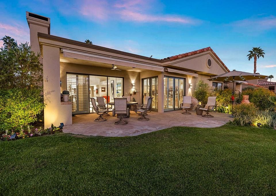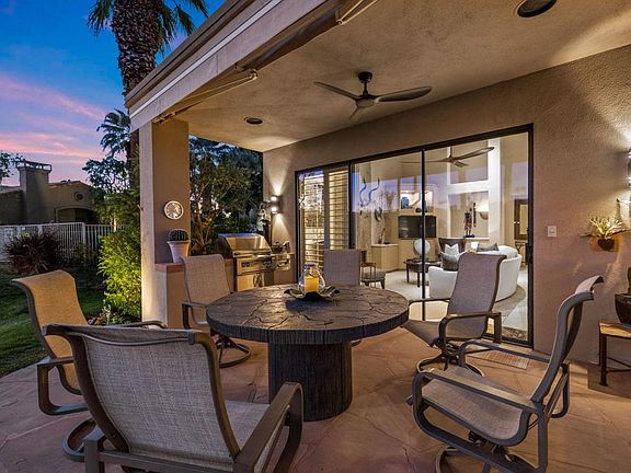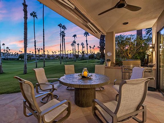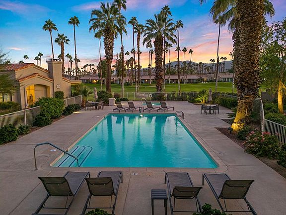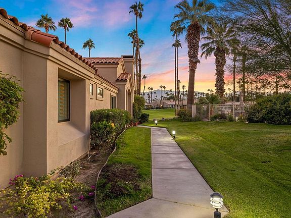 Presenting a truly exceptional residence, this magnificent 3-bedroom, 3.5-bath condominium at Palm Valley Country Club offers a remarkable 2,489 square feet of luxurious living space. Positioned on the 18th fairway of the prestigious Championship Golf Course, this home boasts sweeping southern panoramic views of serene water features, lush greens, majestic mountains, and a cascading waterfall, all complemented by the proximity to an exquisite pool and spa.This residence exemplifies refined living with a formal dining room, a grand living room with soaring ceilings and an elegant fireplace, and a breathtaking master retreat. The master suite features a private patio, an expansive walk-in closet with custom built-ins, and a pull-down ladder leading to an attic cedar-lined closet--an ideal blend of sophistication and practicality. The property is filled with an abundance of built-in cabinetry, ensuring both elegance and functionality throughout.The master bath is a spa-like sanctuary, offering dual vanities, a dedicated dressing area, and a spacious, beautifully designed shower. Step outside to the extended flagstone patio, an entertainer's dream, which features a built-in barbecue, electric retractable awning, and integrated outdoor speakers, while a state-of-the-art sound system fills the home with exquisite acoustics.Further enhancing this residence is an attached double-car garage and a separate golf cart garage, with newly installed epoxy floors. Your dream home awaits!