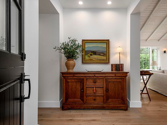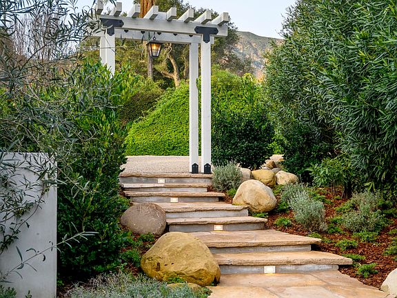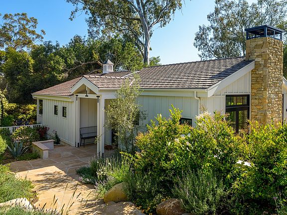 Down an enchanted private lane off Upper Hot Springs Road, you will find a recently constructed ''San Ysidro Ranch'' style cottage on a secluded private half acre. This house is fully furnished or unfurnished for $16,000 per month. This is available for a 1 year extendable lease starting October 15, 2024. Proper foyer entrance leading to spacious living room with high vaulted 14 foot ceilings, custom cut stone fireplace surrounded by glass metal doors and windows facing incredible mountain views. Gorgeous French oak floors throughout, beautiful tile floors in bathrooms. Fenced back yard. Living room has built-in cabinets for exceptional storage. Top of the line appliances, stone counters, center island overlooking dining room and living room. Multiple outdoor dining areas and large contemporary fountain. AC throughout house, small upstairs attic for extra storage. Two large flat screen TV's in primary bedroom and living room. Two private decks off bedrooms. Montecito indigenous landscaping includes gardener every other week. Tenant is responsible for cable TV, internet, and electric. Hookup for electric vehicle. Please do not disturb tenants. Call listing agent for information and showings. Thank you.