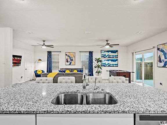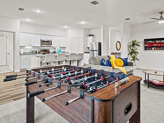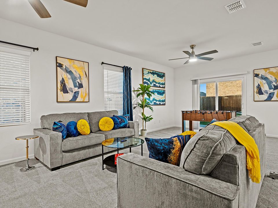 This modern, newly built home features 3 bedrooms with queen beds and 2 full bathrooms. The property is fully furnished with stylish finishes, granite countertops, hardwood floors, and central A/C. A foosball table provides added entertainment, and the living area includes a TV.