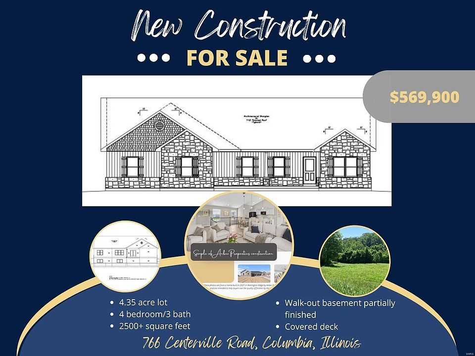 One of a kind new construction opportunity awaits…STILL TIME TO MAKE SOME SELECTIONS on this 4 bed/3 full bath 1 story home on 4.35 acre walkout lot w/ oversized (35x26) 3 car side entry garage. This impressive home features stone & siding combo exterior. Country living just 1 minute from Historic Main Street in Columbia. Open floor plan w/ COREtec luxury vinyl plank flooring, stack-stone corner fireplace, cathedral ceilings, custom kitchen with upgraded cabinets, granite countertops, 7x5 walk-in pantry, stainless steel appliances includes dishwasher, microwave, stove/oven & refrigerator. Split bedroom floor plan. Master suite boasts trey ceiling w/ recessed lights, walk-in closet. Master bedroom features double bowl vanity, linen closet & shower. Oversized main floor laundry. 9' ceilings in partially finished walk-out basement w/ bedroom and full bath. Enjoy the tree-lined backyard from covered deck complete w/ ceiling fan & recessed lights. City water. Private septic. ECD 01/2023