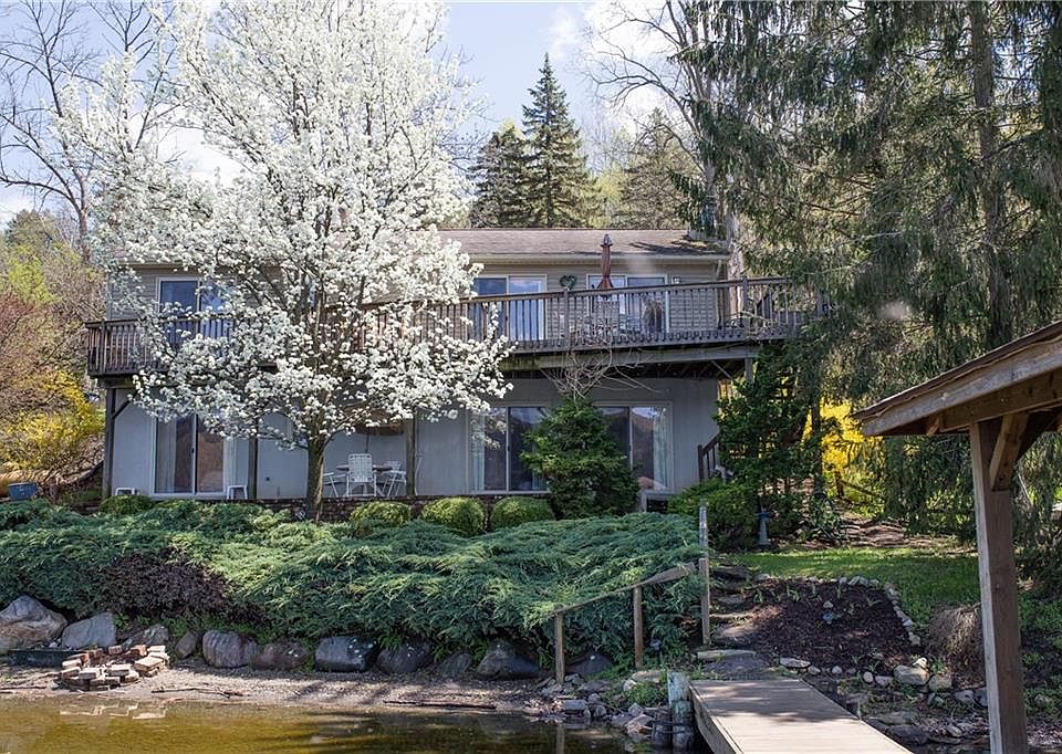 Welcome to 766 East Lake Rd on Keuka Lake's east side! This is all you could ask for in a lake home. This ranch home with fully finished basement has an open concept living, dining, and kitchen area with master bedroom and en suite, all walking out to a large deck facing the lake! Another bedroom and full bathroom on the main floor make accessibility easy. In the fully finished lower level you'll find a huge bonus room with fireplace, another bedroom and full bath which open to the lake level. All of this on 90 ft of shale beach (and huge permanent dock!) situated on a cove in a wonderful location. This home also has central air, plenty of parking with additional land, and beautiful landscape. Be sure to come see for yourself!