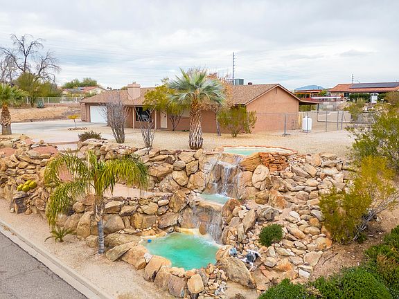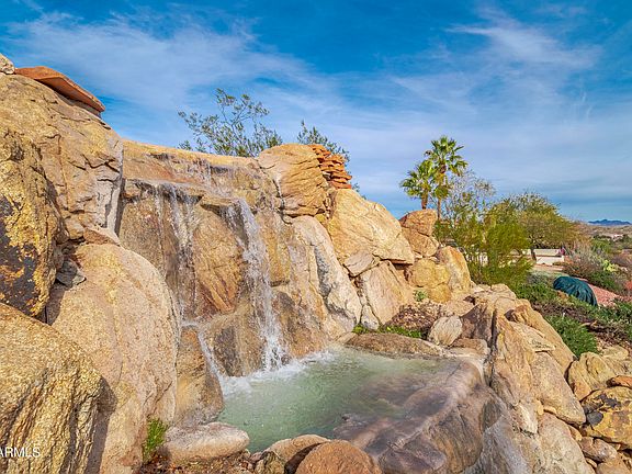 HUGE PRICE REDUCTION ... AMAZING home on almost 3/4 an acre with its very own WATERFALL !!! This is truly a PERSONAL OASIS in the DESERT! This 3bd, 2 ba home boasts quality throughout. Very inviting living room with a warm and cozy propane fireplace tucked into the corner, Beautiful Knotty pine custom Kropf Cabinets line the kitchen that looks out to your grassy backyard and the Bradshaw and Weaver mountain ranges. Two large guestrooms and a very comfortable master bedroom with a walk-in tile shower. A masterfully crafted addition to this home allows for an oversized indoor laundry and storage space as well as a large double office area. The backyard has a wonderful grass lawn with a crystal clear tranquil water feature that is perfect for dipping your toes or relaxing and enjoyi your AMAZING east mountain views. The detached 2-car garage is perfectly located just a few steps away from your home. Down below your home, you have a wonderful cement-to-gravel drive that takes you to the bottom of your property to an incredible 1240-square-foot workshop with plenty of electrical outlets, self-contained woodworks sawdust vacuum, and loads of cabinetry. The shop has another additional storage area with separate double-door entry access. There is so much potential on this property to do so many things .... HUGE area for RV, Trailer, or boat storage too. Please see the features and upgrades document for a complete list of all the improvements and upgrades completed on this ONE-OF-A-KIND special home. You will not find another property like this one anywhere in Wickenburg!!!