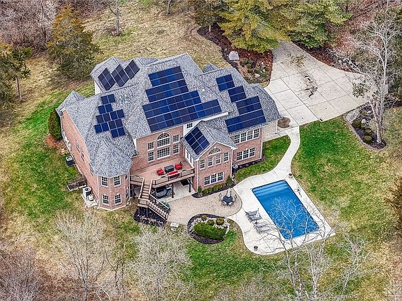 Located down a private drive on over 5.6 acres is this showstopping 6,100+ sqft home! Offering 4 bedrooms, 4.5 baths, a finished basement, inground pool, bonus detached garage, private sports court and so much more! Equipped with a whole house Solar Edge system with battery backup (2022) offering desirable sustainability and substantial energy savings. The soaring two story entry offers perfect views of the completely private rear yard through the massive wall of windows in the living room. Complete with a floor to ceiling stone fireplace and wall of builtins. Fully equipped adjacent eat in kitchen and breakfast room with walkout access to the rear deck. Desirably located on the main floor is the oversized primary suite with vaulted ceilings, a cozy fireplace, and sitting area. Complete with a full ensuite including a double sink vanity, dual toilets and a large walk in closet. Upstairs is home to 3 additional bedrooms and 2 full bathrooms. Even more living space offered by the finished walkout basement - truly an entertainer's dream! Expansive rec room with projector screen and wet bar plus a "man cave" style billiards room. Walkout to the paver patio overlooking the inground pool with automatic pool cover (2020) and serene backyard views. Bonus detached garage/workshop space and concrete sports court - currently setup for pickleball. This is a one of a kind property ready for it's next owner - MUST SEE!