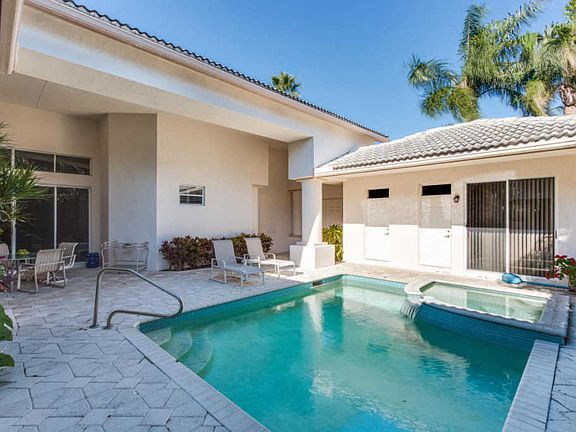 REDUCED FOR QUICK SALE!! THIS PROPERTY PRICED UNDER MARKET VALUE! Enter through a Tropical Courtyard, the perfect space to begin entertaining. This custom residence is designed with vaulted ceilings, well Maintained and is Light and bright.This home has a separate guest quarters within the Courtyard that can work very well as an office or studio with its own pvt. bathroom.Partially Covered Patio.Open kitchen looks into the family room. Large floor to ceiling windows looking out into the Tropical courtyard.Generous Master bedrm. with sitting area & Plantation shutters.2 lg.walk in closets, large master bath w/soaking tub, separate shower & 2 sinks.NON MANDATORY COUNTRY CLUBMemberships avail. and optional.