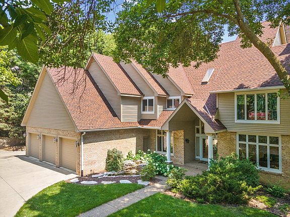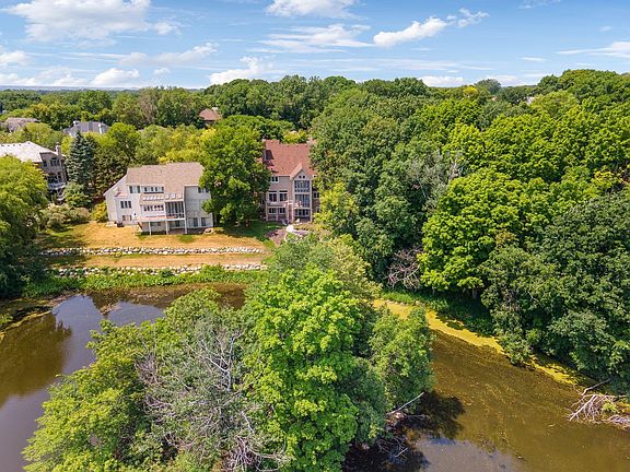 Gorgeous light in this stunning home located on pond with island view. 2 story three season porch overlooks pond, many skylights throughout home, large chef's kitchen with center island. Fantastic home for entertaining with multiple living and dining spaces on main floor to gather and large amusement room in walk-out lower level with fireplace and bar. Private main floor office with library shelving. Upper level features generous bedrooms each with ensuite bath and walk-in closet, primary suite is extra spacious with huge spa-like bath and steam shower, jacuzzi, and big walk-in closet with lots of storage space. Home also features sauna, picturesque patio, and 8 car heated garage.