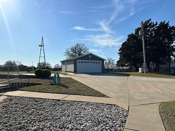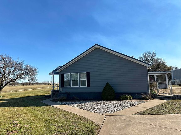 If you're looking to move into the country look no further. This 2004 OAKCREST VIN# 0C050415802AB sits on 7.5 acres more or less. This home features 3 bedrooms and 2 bathrooms. Covered wooden front porch is a great place to watch the Oklahoma sunrise. There are 2 living areas, one has a wood burning fire place. Kitchen has island with electrical outlets, electric cook top stove and wall oven. Inside utility room and mudroom right of utility room. Back patio is enclosed and covered. House has automatic Generac generator. Shop -x 30x60 with electricity 1800 sq feet MOL **concrete block foundation for house. 2 car Garage 20x30 electricity 2 car carport Barbed wired fence all the way around the property