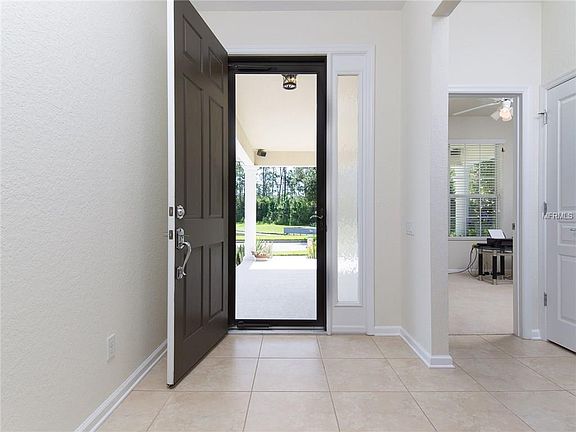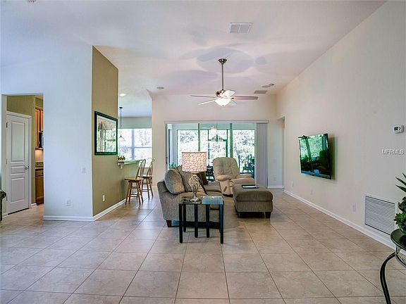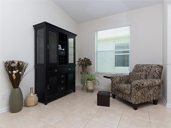 This wonderful home built in 2010 is ready for a quick closing. This popular "Plymouth" floor plan features an open air front porch with brick paver driveway and two car garage. This original owner has enjoyed the fantastic water view from the front porch each day. The gourmet kitchen boats of 42" cabinets, granite countertops, stainless steel appliances and a cozy breakfast nook with built-in granite table. The owner's suite features separate garden tub and shower, dual sinks and ample storage in the spacious walk-in closet. Two additional bedrooms share a nicely appointed bath. Ceramic tiled flooring through out all common areas in this open floor plan. The separate formal dining room and large great room with sliding glassed doors overlooking the screened and covered lanai and back yard with wooded view. Watch the nightly fireworks from either the covered front porch or back yard. Community features pool with cabana, playground, bike path, walking paths, conservation views and low HOA fees at $114 per month. Near shopping with easy access to major roads.