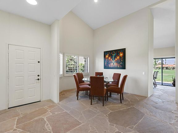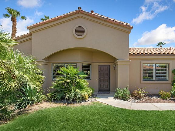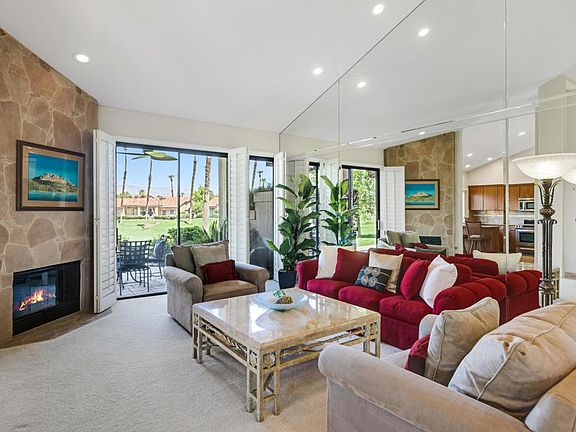Welcome to Palm Valley CC and the highly desired Sycamore floorplan. This 3 BR / 3 BA end unit condo is located on a quiet cul-de-sac with a large greenbelt and tropical landscaping that surrounds the front of unit, walkway and fairway patio providing a peaceful serene setting. Unit features a fully renovated kitchen, upgraded baths and a beautifully designed office space with two workspaces off the master bedroom suite with additional storage and direct access to a finished garage. Enjoy the morning sun from the north-east facing patio with expansive fairway and water views from your patio. Unit includes spacious living & dining areas with a fireplace and wet bar for entertaining. The kitchen area includes large granite-like counter/island workspace, stainless appliances, custom cabinetry, and expansive view of golf course greenbelt with mountain views. Primary and main guest bedrooms include custom closet spaces and en suite baths. All baths feature walk-in showers, custom cabinets, granite counters, and updated lighting. Other amenities include solar lights, Hunter Douglas roller shades in kitchen and shutters throughout along with a 2-car garage. Sold furnished with exceptions to personal items and artwork.