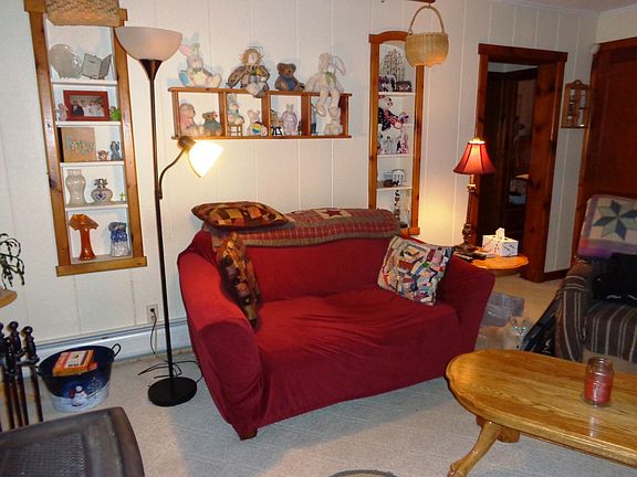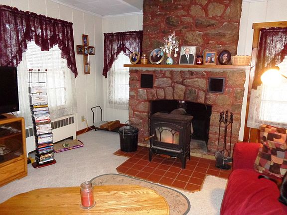 Modest size 2 BR bungalow with walk-up half story attic suitable to finish off as added BR or other living space. Living room has a large stone FP with wood stove insert. Living room is large enough for a DR section by the kitchen. Full bath has been updated. Has HW heat and a rear heated enclosed porch. Newer roof. There is a large det. garage capable of housing 4 vehicles. Garage has a studio apartment which commands rent of about $315-$320 per month plus util. Extra room was a gun shop. Gar. has been used to house cars taken off the road during winter months. Property well maintained.