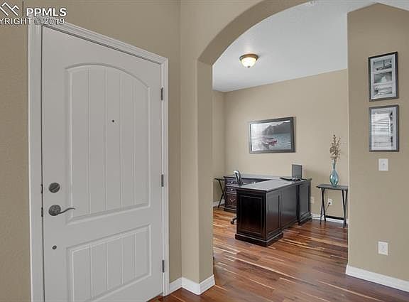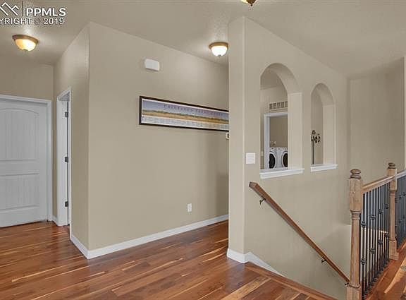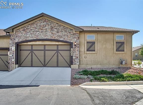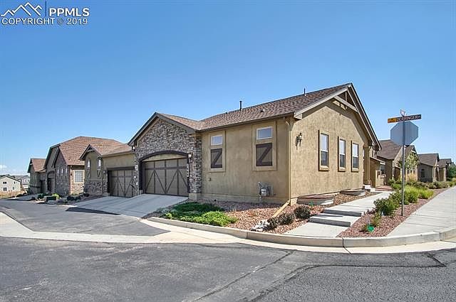 Luxury Ranch home with upgraded extended covered patio and finished basement that offers maintenance free living. Offers a large amount of natural light with 9' ceilings, wood floors throughout the main living area. Large archways to office, pantry, upgraded kitchen counter tops, large island, stainless steel appliances, and built in speakers throughout the home. Extended covered Outdoor patio with privacy wall. Cozy living room gas fireplace with stone work is the Centerpiece of the living room. Large master bedroom with five piece bathroom and walk-in closet. Decorative wrought iron and wood hand railing leads to the finished basement. The basement includes storage space, large family rec room, two bedrooms, and a full bath. Central A/C keeps the home cool during the hot summer. Minutes from Powers Corridor shopping and other services. Property landscape and exterior is maintained by the HOA. You will not want to miss this corner lot townhome.
